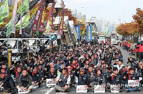 (부산=연합뉴스) 강선배 기자 = 민주노총 전국건설노조 부산건설기계지부 노동자들이 7일 오후 부산 연제구 거제해맞이역 인근에서 굴삭기 등 건설기계 150대를 동원해 건설기계 임대료 현실화 등을 요구하는 '부산건설기계지부 총력 결의대회'를 열고 있다. 2025.11.7