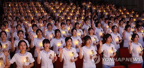 (인천=연합뉴스) 임순석 기자 = 7일 인천 연수구 가천대학교 메디컬캠퍼스에서 열린 '제78회 가천대학교 간호대학 나이팅게일 선서식'에서 간호학과 2학년 학생들이 현장실습을 앞두고 나이팅게일의 희생과 숭고한 정신을 본받아 전문 간호인으로서 책임과 의무를 다할 것을 다짐하는 선서를 하고 있다. 2025.11.7
