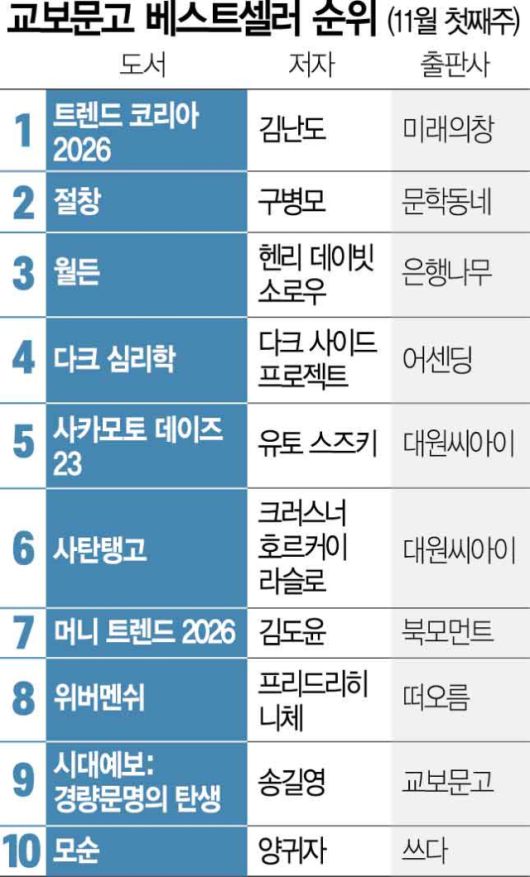 11월 첫째 주 교보문고 종합 판매 집계에 따르면 ‘트렌드 코리아 2026’이 6주 연속 판매량 1위를 지키며 식지 않는 인기를 이어갔다. 구병모의 장편소설 ‘절창 切創’은 전주에 이어 2위였고 ‘머니 트렌드 2026(7위)’, ‘시대예보: 경량문명의 탄생(9위)’ 등 경제·미래 전망서도 꾸준히 상위권을 유지했다.
