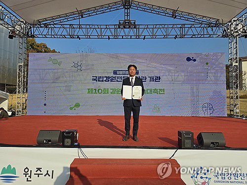 (원주=연합뉴스) 7일 강원 원주시 국립강원전문과학관에서 열린 제10회 강원과학기술대축전에서 정진근 강원대 지식재산전문인력양성중점대학사업단장이 강원지식재산 유공자 표창을 받고 기념 촬영을 하고 있다.