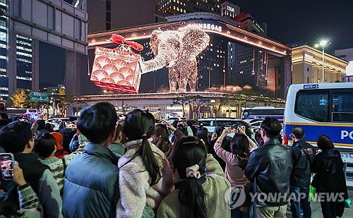 (서울=연합뉴스) 김인철 기자 = 7일 서울 중구 신세계백화점 본점 외관에 설치된 '신세계 스퀘어' 전광판에 '시간을 잇는 마법의 세계'라는 주제로 크리스마스 영상이 상영되고 있다. 2025.11.7