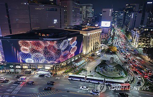 (서울=연합뉴스) 김인철 기자 = 7일 서울 중구 신세계백화점 본점 외관에 설치된 '신세계 스퀘어' 전광판에 '시간을 잇는 마법의 세계'라는 주제로 크리스마스 영상이 상영되고 있다. 2025.11.7