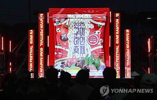 (구미=연합뉴스) 7일 오후 경북 구미시 구미역 앞에서 열린 '2025 구미라면축제'에서 축제 조형물이 눈길을 끌고 있다. 사흘간 이어지는 올해 축제에서는 셰프들이 갓 튀긴 라면으로 만든 25가지 창의적 요리 등을 맛볼 수 있다. 2025.11.7 [구미시 제공. 재판매 및 DB 금지]