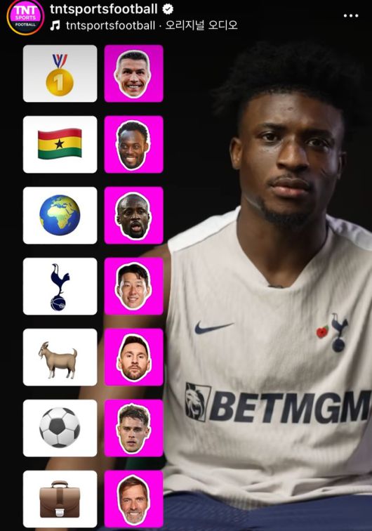 영국 'TNT 스포츠'는 8일(이하 한국시간) 쿠두스 인터뷰를 전했다. 쿠두스는 최근 축구계에서 유행하는 이모지 인터뷰에 임했다. 이모지 의미를 진행자가 설명해서 질문을 하면 한 단어 혹은 한 선수로만 답하는 인터뷰다.