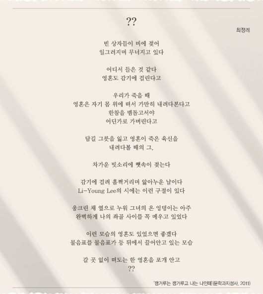 사랑을 어떤 모양의 글자로 표현할 수 있겠는가 누군가 제게 묻는다면 저는 이 시 ‘??’를 보여줄 용의가 있습니다. 그리고 나지막이 낭독도 해줄 수 있겠죠. 사랑은 사람과 사람이 함께 같은 잠자리에서 자는 모습이에요. 한 사람만 한 사람을 안아주는 모습처럼 보이지만, 사실은 안겨주고 안아주는 거예요, 라고.