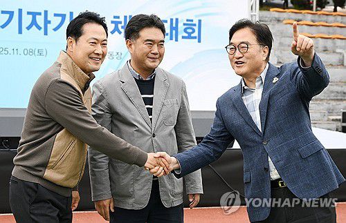(서울=연합뉴스) 우원식 국회의장(오른쪽)과 국민의힘 장동혁 대표(왼쪽)가 8일 서울 여의도 국회의사당 운동장에서 한국사진기자협회가 연 '2025 사진기자가족 체육대회'에 방문해 인사하고 있다. 가운데는 이호재 한국사진기자협회장. 2025.11.8 [사진공동취재단]