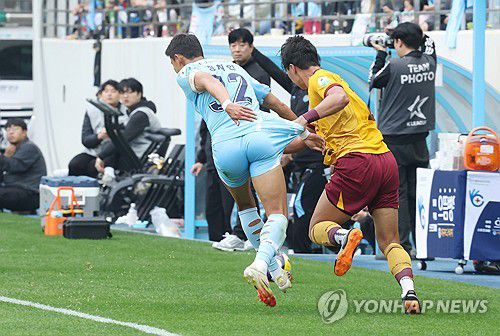 (대구=연합뉴스) 박세진 기자 = 8일 대구 북구 대구iM뱅크PARK에서 열린 '하나은행 K리그 1' 대구FC와 광주FC 경기. 대구FC 정치인과 광주FC 조성권이 터치라인 밖에서 몸싸움을 이어가고 있다. 2025.11.8