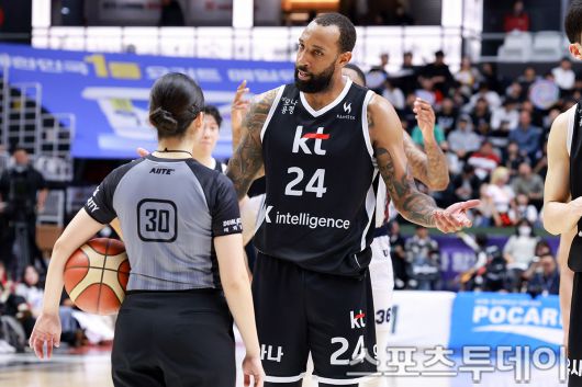 [수원(경기)=스포츠투데이 안성후 기자] 2025-2026 LG전자 프로농구 수원 KT-부산 KCC 경기가 8일 오후 경기 수원시 수원 KT 소닉붐 아레나에서 열렸다. 이날 부산 KCC가 수원 KT 소닉붐을 89:81로 승리했다. KT 데릭 윌리엄스가 KCC 최준용의 파울을 어필하고 있다. 2025.11.08. [스포츠투데이 안성후 기자 sports@stoo.com]