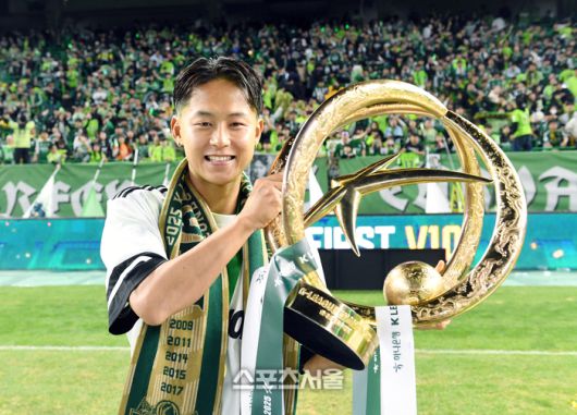 전북 현대의 이승우가 8일 전주월드컵경기장에서 열린 하나은행 K리그1 대전 하나 시티즌과 경기 후 진행된 우승 기념 행사에서 팬들 앞에서 트로피를 들고 기념촬영을 하고 있다. 2025. 11. 8.전주 | 박진업 기자 upandup@sportsseoul.com [기사제보 news@sportsseoul.com] Copyright ⓒ 스포츠서울&sportsseoul.com