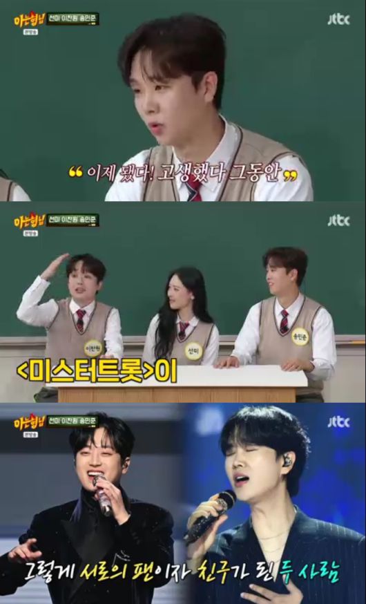 이날 송민준은 "찬원이가 (내가 출연한) '미스터트롯2' 방송 후에 나한테 전화해서 30분간 정말 울기만 했다. '너무 잘 될 거다'라고 해주더라"며 뜨거운 우정을 밝혔다.