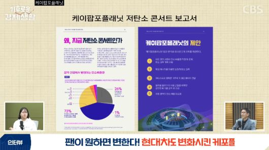 ◇ 김나연> 저희가 봤는데 탄소 배출량을 공개는 하고 있는데 어떻게 줄이겠다는 내용은 없어요. 그래서 저희가 그 부분에 대해서 계속 확인하고 지켜봐야겠다고 생각하고 있고요. 그리고 2030년까지 지속 가능 공연을 국내외 모든 공연에 적용하겠다고 이야기한 게 인상 깊었습니다.