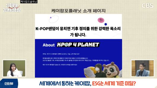 ◇ 김나연> 저희는 전 세계 K팝 팬들과 함께 기후행동을 하는 온라인 플랫폼입니다. 지금 K팝 산업계나 K팝 아이돌들이 모델로 참여하는 기업 등 K팝과 관련된 산업계의 기후행동을 요구하는 다양한 캠페인을 하고 있습니다.