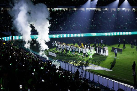 [OSEN=전주, 고성환 기자] 오직 전북 현대만 할 수 있는 챔피언 대관식이다. 우승 트로피 10개가 진열된 가운데 전주성이 팬들의 환호와 녹색 불빛으로 물들었다.