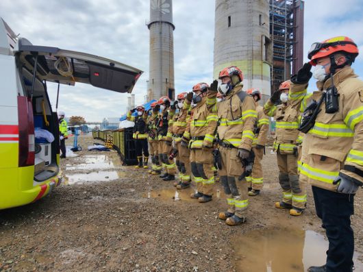 9일 오전 울산화력발전소 붕괴 현장에서 수습된 매몰자를 병원 이송전 소방대원들이 고인에 대한 예우를 갖추고 있다. 사진 소방청 |