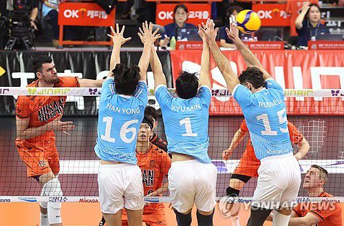 (부산=연합뉴스) 강선배 기자 = 9일 부산 강서체육관에서 열린 프로배구 V리그 남자부 OK저축은행 읏맨과 대한항공 점보스의 경기. OK저축은행의 디미트로프가 스파이크하고 있다. 2025.11.9