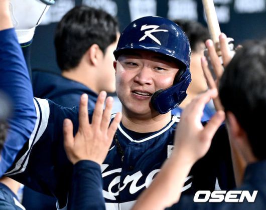 9회초 무사 1루 상황 한국 이재원이 달아나는 중월 투런포를 날리고 홈을 밟은 뒤 더그아웃 동료들과 기뻐하고 있다. 2025.11.09 / dreamer@osen.co.kr