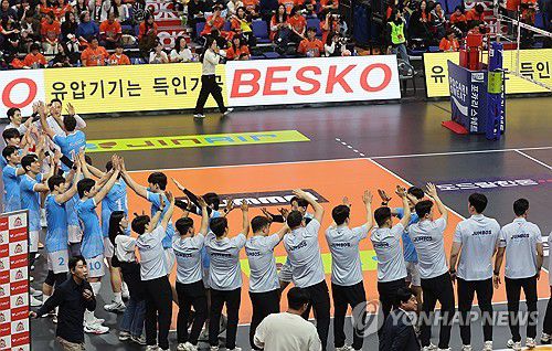 (부산=연합뉴스) 강선배 기자 = 9일 부산 강서체육관에서 열린 프로배구 V리그 남자부 OK저축은행 읏맨과 대한항공 점보스의 경기. OK저축은행에 3대 1로 승리한 대한항공 선수들이 승리의 기쁨을 나누고 있다. 2025.11.9