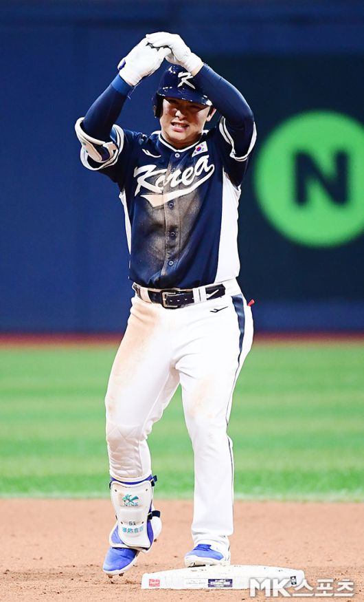 9회초 2사 2루에서 대표팀 문현빈이 1타점 2루타를 치고 진루하고 있다.
