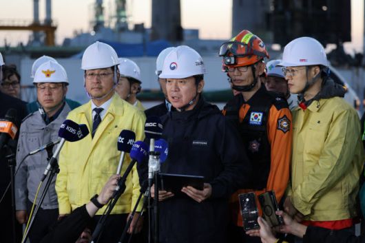 김영훈 고용노동부 장관이 울산화력발전소 보일러 타워 붕괴 사고와 관련해 현장 브리핑을 하고 있다. (사진=연합뉴스) |