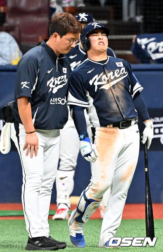 9회초 2사 2루 한국 문현빈이 타석에서 파울 타구에 맞은 후 고통을 호소하고 있다. 2025.11.09 / rumi@osen.co.kr
