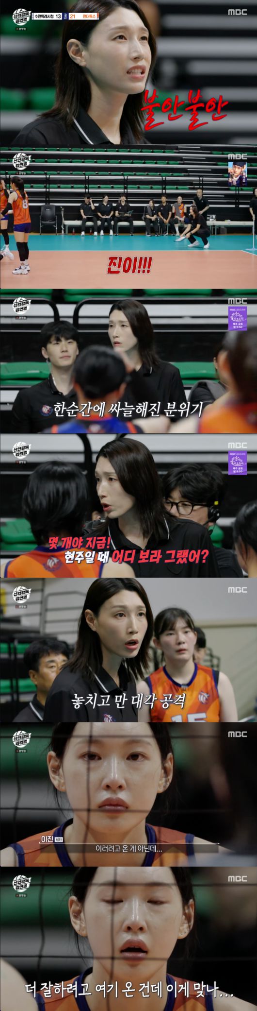 이후에도 이진의 실수는 이어졌다. 김 감독의 목적타 서브 지시가 범실로 이어졌고, 블로킹에서도 실수를 반복하자 김연경 감독은 "진아 어디로 들어가"라며 잇따른 실수에 답답함을 감추지 못했다.