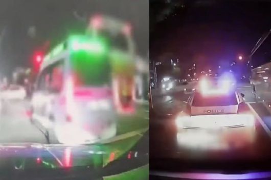 위급한 산모를 이송하던 구급차에 길을 터주지 않은 순찰차가 논란이 됐다. 지난달 30일 밤 9시쯤 부산 서구의 한 도로에서 순찰차 앞을 지나는 사설 구급차(왼쪽)와 구급차 블랙박스에 찍힌 순찰차 모습. 연합뉴스 |