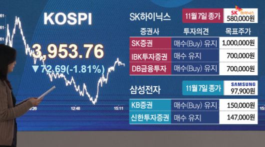 글로벌 인공지능(AI) 거품론이 세계 증시를 강타하면서 지난 7일 코스피가 10거래일 만에 4000선이 붕괴됐다. 뉴욕 증시에서 팰런티어와 엔비디아 등 대표 AI 종목이 급락하고, 골드만삭스와 모건스탠리 최고경영자(CEO)들이 “향후 10~20% 조정이 불가피하다”고 경고하면서 기술주 전반에 불안 심리가 번졌다. 여기에 미국 정부가 엔비디아의 최신 AI 칩의 중국 수출을 제한하고 원ㆍ달러 환율이 1450원을 넘어서며 외국인 매도가 확대되자 국내 투자심리도 급격히 위축됐다.