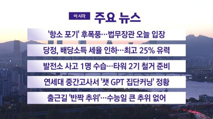 ■ '항소 포기' 후폭풍…법무장관 오늘 입장 ■ 당정, 배당소득 세율 인하…최고 25% 유력 ■ 발전소 사고 1명 수습…타워 2기 철거 준비 ■ 연세대 중간고사서 '챗 GPT 집단커닝' 정황 ■ 출근길 '반짝 추위'…수능일 큰 추위 없어 [저작권자(c) YTN 무단전재, 재배포 및 AI 데이터 활용 금지] 대한민국 24시간 뉴스채널 [YTN LIVE] 보기 〉 [YTN 단독보도] 모아보기 〉
