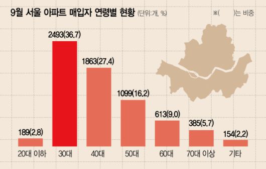 9일 한국부동산원이 발표한 매입자연령대별 아파트 매매 거래현황 통계에 따르면 지난 9월에 신고된 서울 아파트 매매거래량(6796건)의 36.7%를 30대가 매수했다. 30대 매수 비중으로는 2021년 9월(38.85%) 이후 4년 만에 가장 높은 수치다. ★본지 10월 30일자 25면 참조