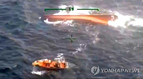 전복된 중국어선으로 접근하는 해경 |