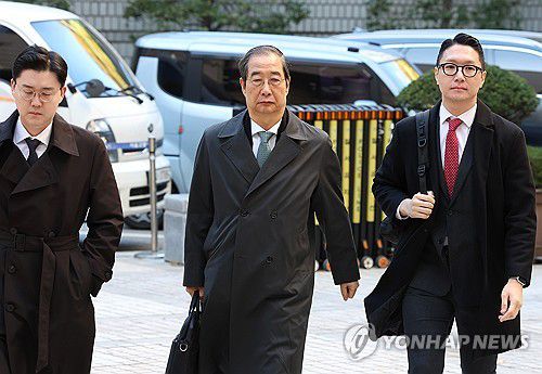 (서울=연합뉴스) 김주형 기자 = 내란 우두머리 방조 혐의를 받는 한덕수 전 국무총리가 10일 서울 서초구 서울중앙지방법원에서 열린 내란 우두머리 방조 및 위증 등 혐의 사건 1심 속행 공판에 출석하고 있다. 2025.11.10