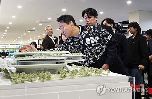 (서울=연합뉴스) 김인철 기자 = 오세훈 서울시장이 10일 서울 종로구 세종라운지에서 열린 제2세종문화회관 건립 설계공모 시상식에서 당선작 및 입상작 작품에 대한 설명을 듣고 있다. 2025.11.10