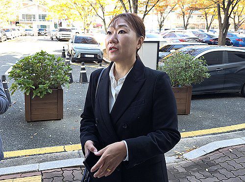 (창원=연합뉴스) 이준영 기자 = 지난해 '정치 브로커' 명태균 씨 관련 의혹을 폭로했던 국민의힘 김영선 전 의원의 회계책임자 강혜경 씨가 10일 창원지법에 김 전 의원과 명씨 정치자금법 위반 사건 증인으로 출석하고 있다. 2025.11.10