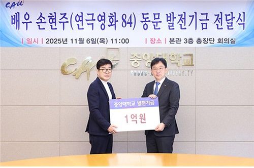 (서울=연합뉴스) 홍준석 기자 = 중앙대학교는 배우 손현주가 교육환경 개선과 인재 양성을 위한 발전기금 1억원을 기부했다고 10일 밝혔다.