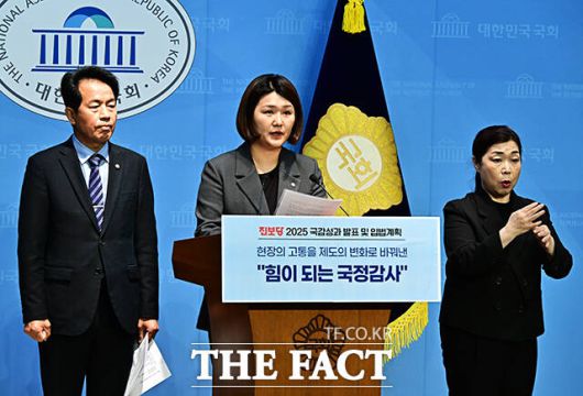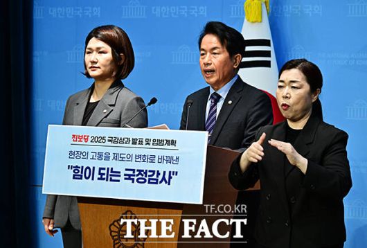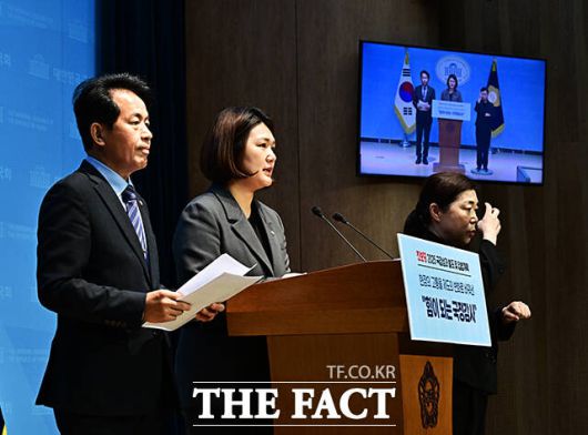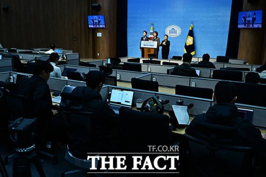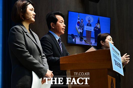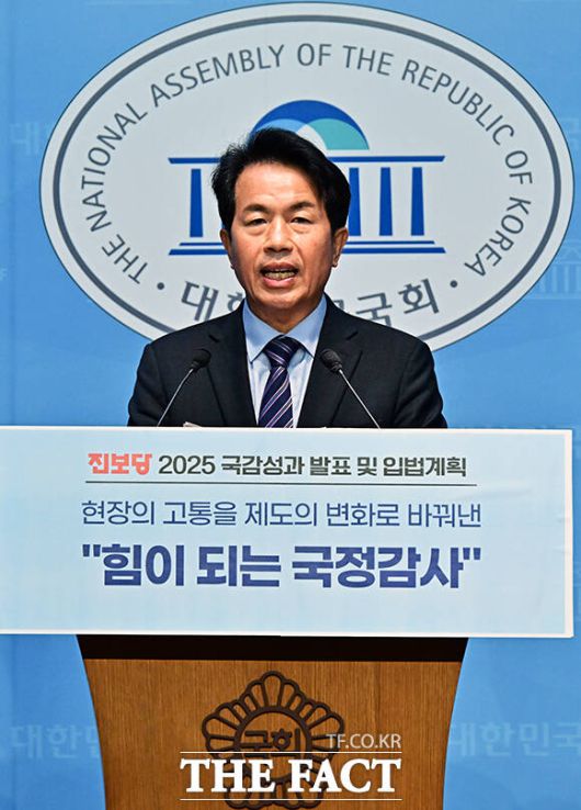 [더팩트ㅣ국회=배정한 기자] 윤종오 진보당 원내대표(가운데)와 손솔 의원(왼쪽)이 10일 오전 서울 여의도 국회 소통관에서 기자회견을 열고 국정감사 성과 및 정기국회 입법 계획 발표를 하고 있다. 왼쪽은 손솔 진보당 의원.
