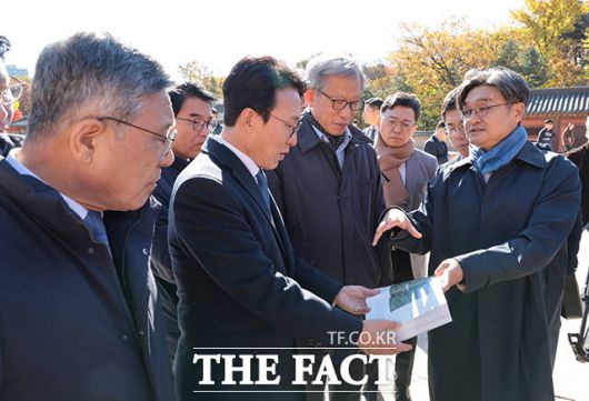 [더팩트ㅣ임영무 기자] 김민석 국무총리(왼쪽 세 번째)가 10일 오전 서울 종로구 종묘를 찾아 신희권 서울시립대 국사학과 교수로부터 서울시의 세운상가 재개발 계획에 따른 영향을 보고 받고 있다.