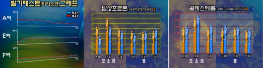 KBS환경스페셜은 2003년 4월 16일 ‘2003 밀렵보고서!-이유 없는 죽음’ 편 실험 결과 그래프다. 야생동물을 먹은 결과 남성호르몬은 별 변화가 없었다. 발기력도 변화가 없거나 떨어졌다. 콜레스테롤 수치는 실험대상 모두 증가했다. 환경스페셜 갈무리 |