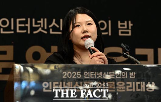 2025 인터넷신문 언론윤리대상이 10일 오후 서울 중구 프레스센터에서 열린 가운데 기자부문 대상을 수상한 더팩트 서다빈 기자가 수상 소감을 밝히고 있다. /임영무 기자 |