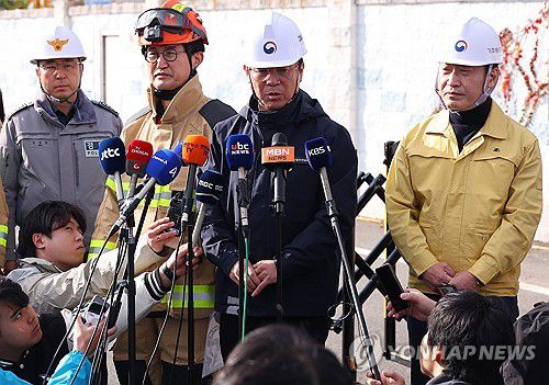 (울산=연합뉴스) 손형주 기자 = 울산화력발전소 보일러 타워 붕괴 사고 엿새째인 11일 오전 발전소 앞에서 김영훈 고용노동부 장관이 현장 브리핑을하고 있다. 2025.11.11