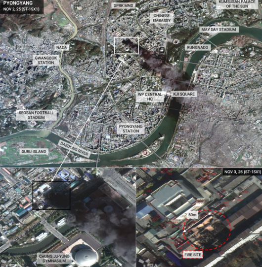 지난 2일 오전 평양 중심부에 위치한 류경호텔 인근 건물에서 대형 화재가 발생해 검은 연기가 치솟는 모습. 하루 뒤인 3일 같은 지역을 촬영한 위성사진(오른쪽 아래)에서는 가로·세로 각 50m 크기의 화재 흔적이 포착됐다. [사진 SI Analytics 보고서]