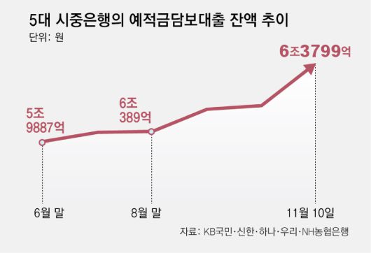 11일 KB국민·신한·하나·우리·NH농협은행 등 5대 은행에 따르면 10일 기준 예담대 잔액은 6조3799억 원이다. 예담대는 이달 들어 6영업일 만에 2122억 원 증가한 것이다. 같은 기간 5대 은행의 주담대 월 증가액(2174억 원)과 비슷한 수준이다. 예담대가 지난해 같은 달엔 오히려 83억 원 감소한 점을 고려하면 이달에 유독 큰 폭으로 늘었음을 알 수 있다.