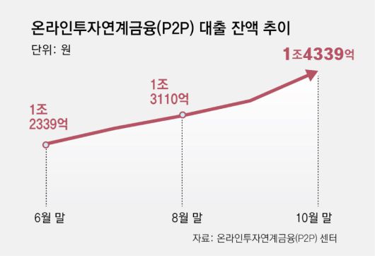 상대적으로 고금리인 P2P 대출도 빠르게 불어나고 있다. 10월 대출 잔액이 1조4339억 원, 월 증가액은 818억 원이었다. 모두 개편된 통계로 집계되기 시작한 2022년 8월 이후 최대치다. 금리가 연 10% 안팎인 P2P 부동산담보 대출은 4월부터 순증으로 전환했는데, 대출 규제가 발표된 10월 한 달에만 80억 원가량 증가했다.