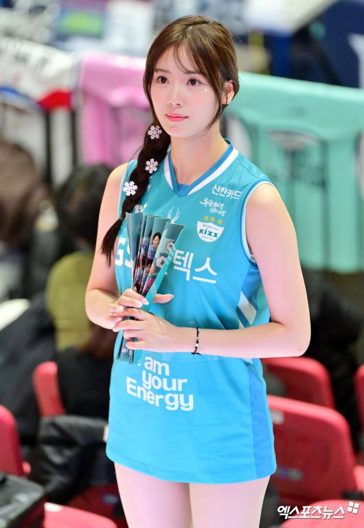(엑스포츠뉴스 수원, 김한준 기자) 11일 오후 경기도 수원실내체육관에서 열린 '진에어 2025-2026 V-리그' 현대건설과 GS칼텍스의 경기, 아야카 치어리더가 미소를 보이고 있다.