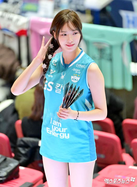 (엑스포츠뉴스 수원, 김한준 기자) 11일 오후 경기도 수원실내체육관에서 열린 '진에어 2025-2026 V-리그' 현대건설과 GS칼텍스의 경기, 아야카 치어리더가 미소를 보이고 있다.김한준 기자 kowel@xportsnews.com