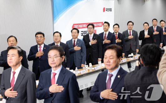 (서울=뉴스1) 이승배 기자 = 장동혁 국민의힘 대표가 12일 서울 여의도 국민의힘 중앙당사에서 열린 지방선거총괄기획단 및 시·도 광역단체장 연석회의에 참석해 오세훈 서울시장을 비롯한 시·도 광역단체장들과 국민의례하고 있다. 2025.11.12/뉴스1photolee@news1.krCopyright ⓒ 뉴스1. All rights reserved. 무단 전재 및 재배포, AI학습 이용 금지.