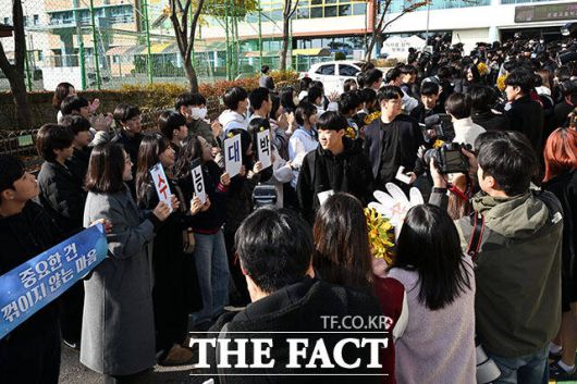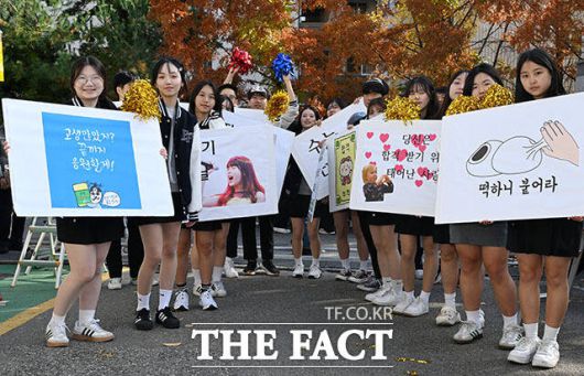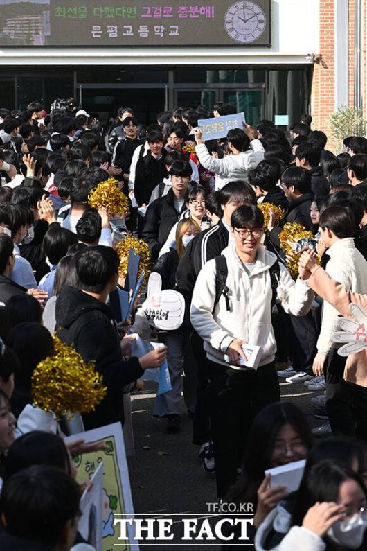 [더팩트ㅣ남용희 기자] 2026학년도 대학수학능력시험(수능)을 하루 앞둔 12일 오전 서울 은평구 은평고등학교에서 1,2학년 학생들이 수험표를 받은 뒤 학교를 나서는 수험생들을 응원하고 있다.
