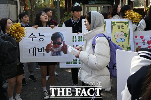 '수능 대박' 수험생 응원하는 교사들과 후배들. |