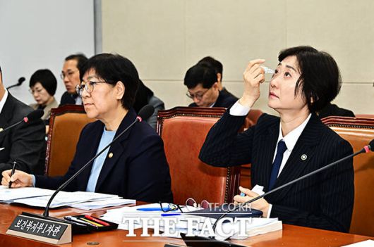 [더팩트ㅣ국회=배정한 기자] 이스란 보건복지부 제1차관이 12일 오전 서울 여의도 국회에서 열린 보건복지위원회 전체회의에 출석해 눈에 안약을 넣고 있다.