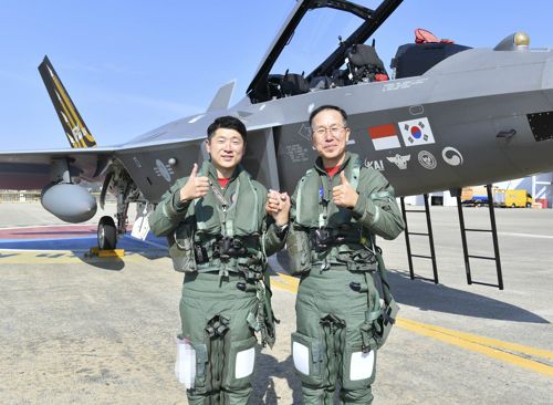 (서울=연합뉴스) 손석락 공군참모총장(오른쪽)이 5일 사천기지에서 진행된 취임 후 첫 지휘비행에서 KF-21 전투기 비행을 마치고 강주훈 소령과 기념 촬영하고 있다. 2025.11.5 [공군 제공. 재판매 및 DB 금지] photo@yna.co.kr (끝) <저작권자(c) 연합뉴스, 무단 전재-재배포, AI 학습 및 활용 금지> |