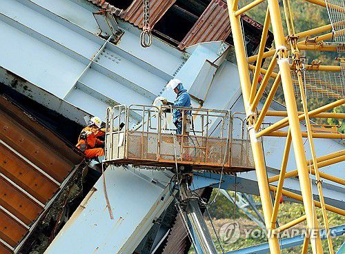 (울산=연합뉴스) 손형주 기자 = 12일 오후 울산화력발전소 보일러타워(5호기)에서 추가 붕괴를 막기 위해 크레인으로 상부 구조물을 고정하는 작업이 진행되고 있다. 이번 사고 매몰자 7명 중 사망자는 5명이며 나머지 2명은 여전히 매몰 상태다. 2025.11.12